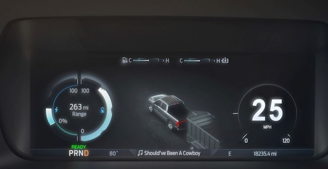If you're away from home at a job or camp site (and definitely not goofing around playing Mario Kart) its Pro Power capabilities outpace even the hybrid model. Base models can pump out 2.4Kw of power, while higher end models can deliver 9.6Kw of power, divided between 2.4 up front and 7.2 through the cab/bed outlets. That's more than even the hybrid version, and since there's no gas motor to rely on once the battery is drained, the truck can send its owner a notification when battery power drops to less than a third of its range. You can also set it up to automatically cut off power output if it gets close to the level you'll need to reach the nearest charging station.